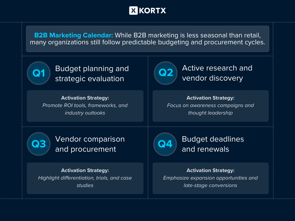 While B2B marketing is less seasonal than retail, many organizations still follow predictable budgeting and procurement cycles.